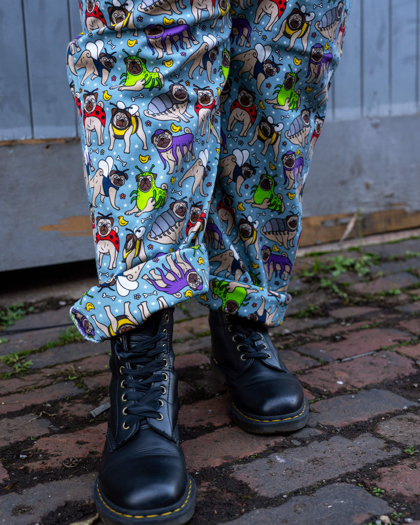 These dungarees are the ulti-mutt in quirky fashion. From their standard fit with a comfy 30”/31” inseam to the vibrant pug party print, they’re a true wardrobe tail-wagger. Whether you’re walking your own four-legged friend or just want to add some doggone fun to your day, these dungarees are your new go-to.